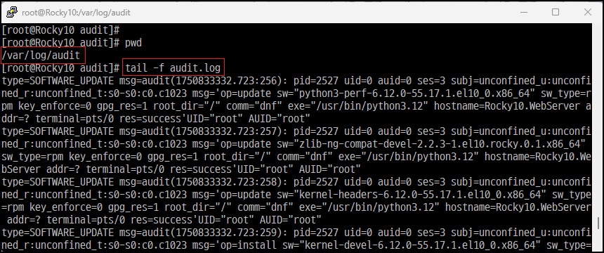 [root@]# tail -f /var/log/audit/audit.log [SELinux 활성화 시 기본 로그 경로]