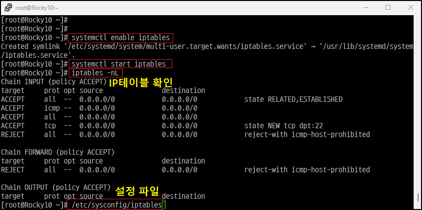 [root@]# dnf install -y iptables-services [iptables 서비스 관련 패키지 설치]