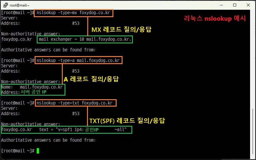 Non-authoritative answer: foxydog.co.kr text = "v=spf1 ip4:공인IP ~all" (정상 응답)