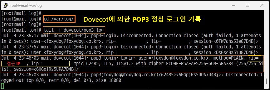 [root@localhost]# tail -f /var/log/dovecot/pop3.log (POP3 실시간 로그 확인)
