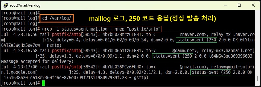 [root@localhost]# grep -i status=sent maillog | grep "postfix/smtp" (로그 확인)