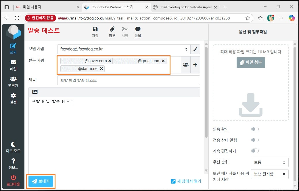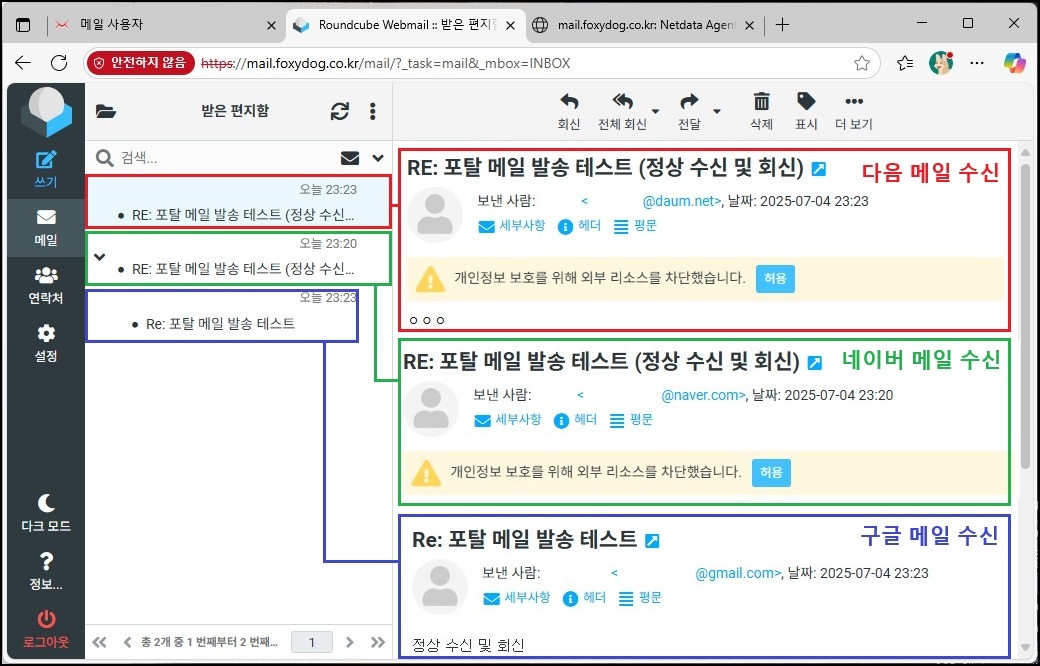 참고로, 대표적인 포털 메일 주소인 네이버(naver.com), 구글(gmail.com), 다음(daum.net)으로 모두 정상 발송이 되었습니다. 이는 발송 서버의 메일 호스트네임과 SPF 정책(IP 일치)만 제대로 설정되어 있다면, 일반적인 수신 메일 서버에서는 비교적 까다롭지 않게 메일을 수신한다는 것을 의미합니다.
