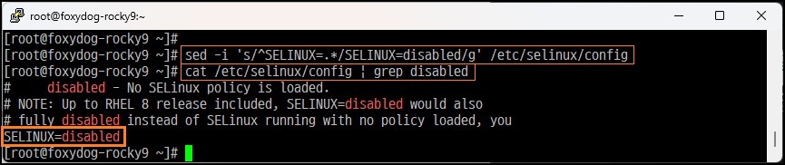 [root@localhost]# cat /etc/selinux/config | grep disabled (변경 확인)