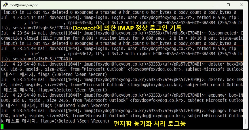 [root@localhost]# tail -f /var/log/dovecot/imap.log (IMAP 실시간 로그 확인)