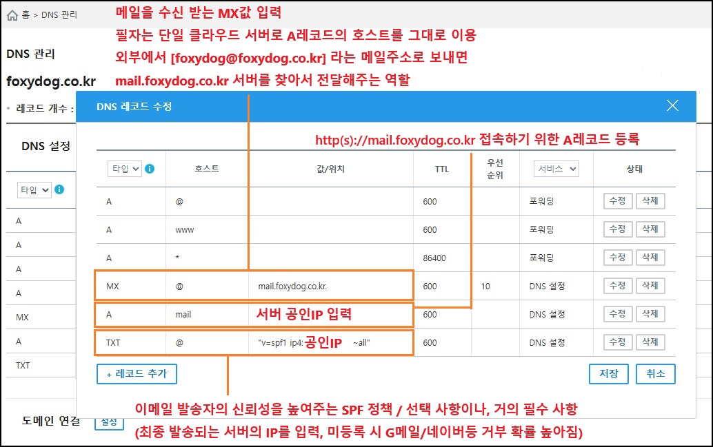 ※ 서버 호스트 네임을 IP로 설정해도 메일 발송은 가능합니다. 하지만 메일 수신의 경우, 내부 도메인 간에는 주고받을 수 있어도 외부에서 메일을 수신받기 위해서는 반드시 도메인의 네임서버(DNS)에 MX 레코드를 등록해야 합니다. 아래는 A, MX 레코드 등록 예시입니다. 도메인을 판매하는 업체 대부분 사용자가 직접 관리할 수 있는 DNS 페이지가 제공됩니다.