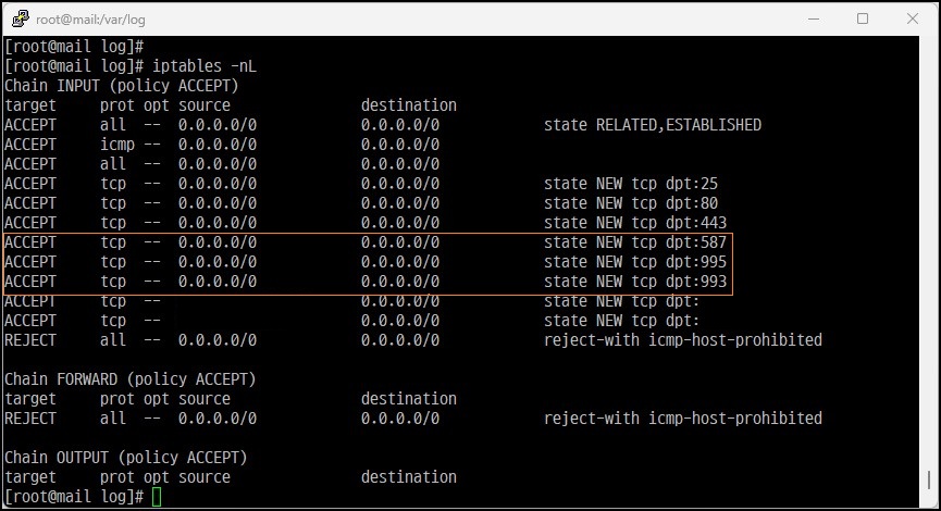 ※ 진행 전 외부 클라이언트에서 접근하기 위한 포트 허용 POP3S(995), IMAPS(993), SMTP(587)
