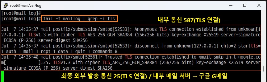 [root@localhost]# tail -f /var/log/maillog | grep -i tls (캡처 참고)