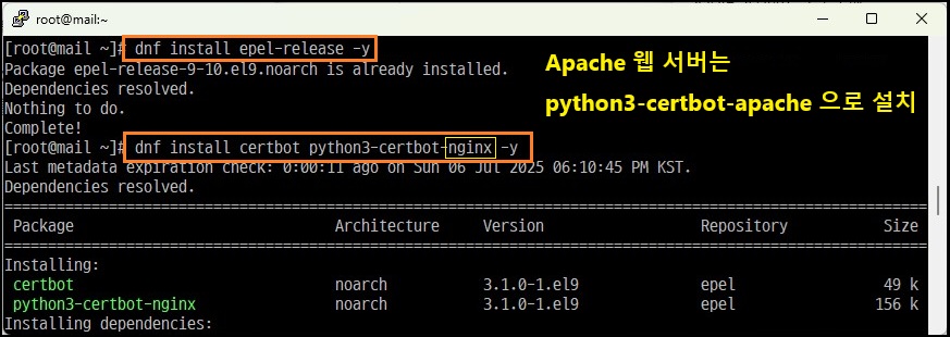 [root@localhost]# dnf install certbot python3-certbot-nginx -y (Certbot, Python3 설치)