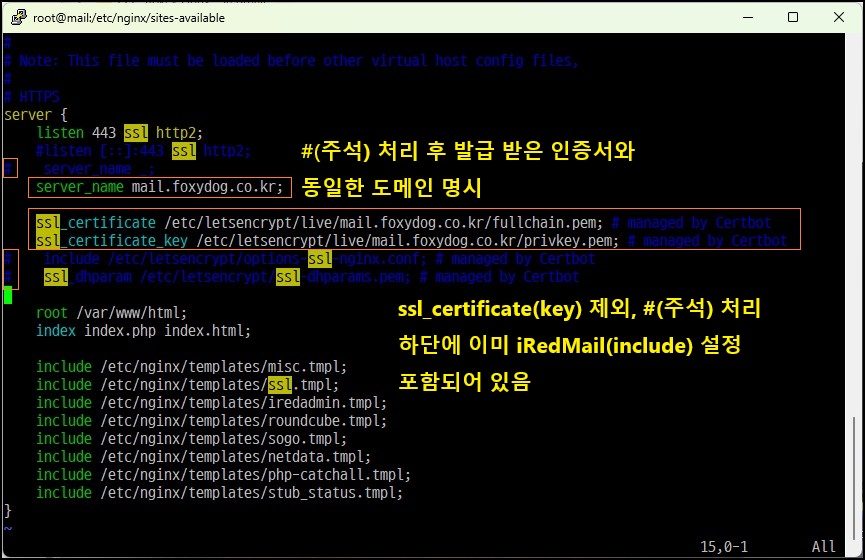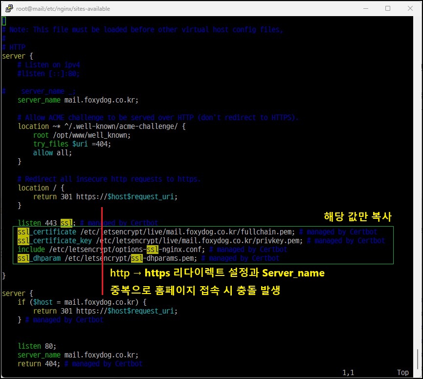 server_name mail.foxydog.co.kr; (인증서를 발급받은 도메인을 명시)