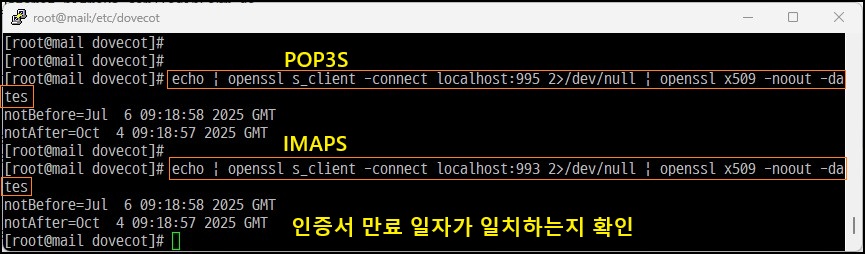 [root@localhost]# echo | openssl s_client -connect localhost:993 2>/dev/null | openssl x509 -noout -dates (SSL 연결 및 인증서 확인)