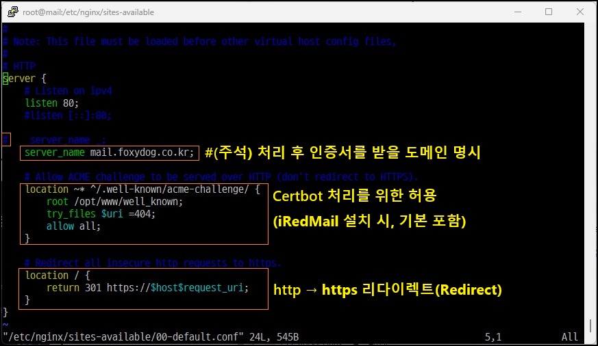 server_name mail.foxydog.co.kr; (인증서를 발급받을 도메인을 명시)
