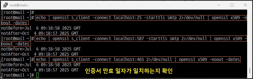 [root@localhost]# echo | openssl s_client -connect localhost:25(587) -starttls smtp 2>/dev/null | openssl x509 -noout -dates (STARTTLS 연결 및 인증서 확인)