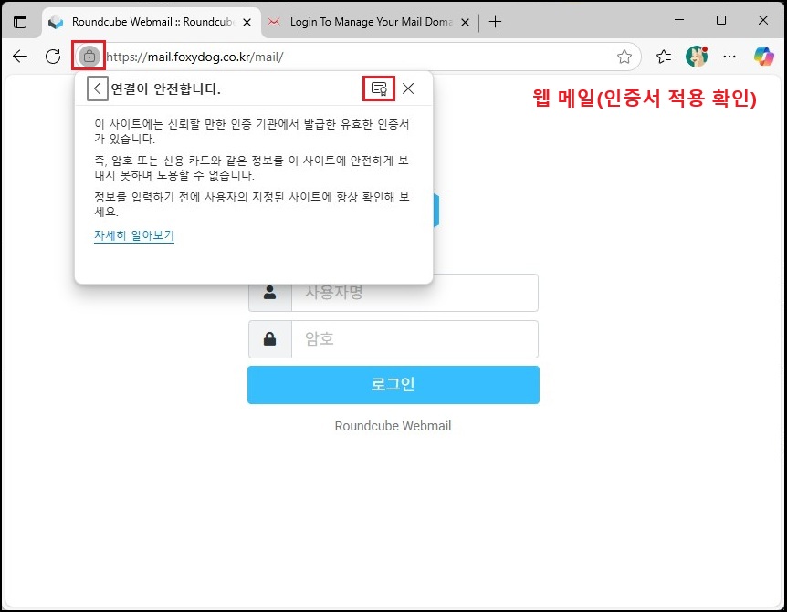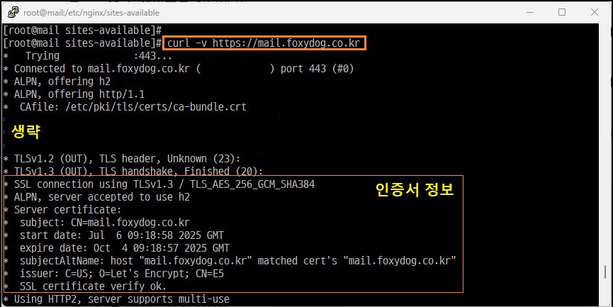 [root@localhost]# certbot --nginx -d mail.foxydog.co.kr (인증서 발급 및 자동 설정)