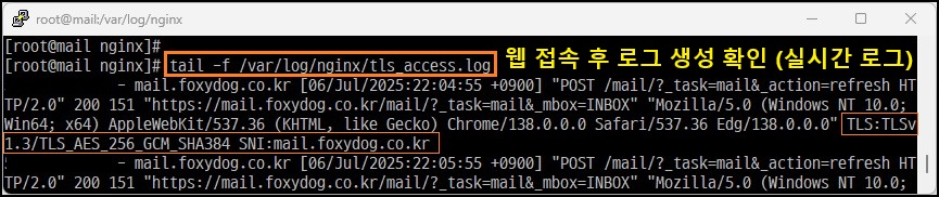 [root@localhost]# tail -f /var/log/nginx/tls_access.log (웹 접속 후 로그 생성 확인)