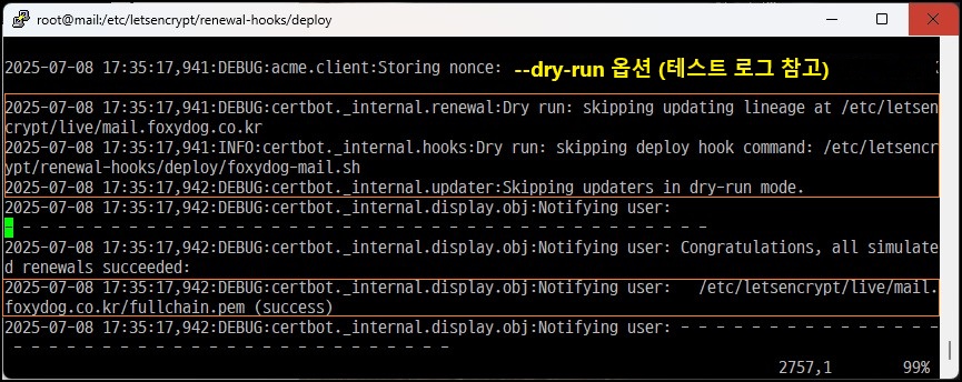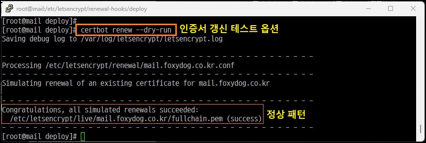※ 테스트에서는 갱신에 문제가 없는지 체크만 하므로 인증서 갱신, Deploy hook 스크립트 명령어, 업데이트를 스킵합니다. 마지막에 인증서 Success 메시지만 확인하면 됩니다. (캡처 로그 참고)
