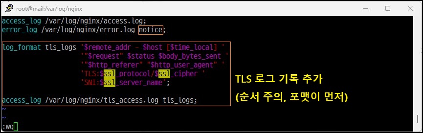 access_log /var/log/nginx/tls_access.log tls_logs; (순서 주의, 로그 포맷이 먼저)