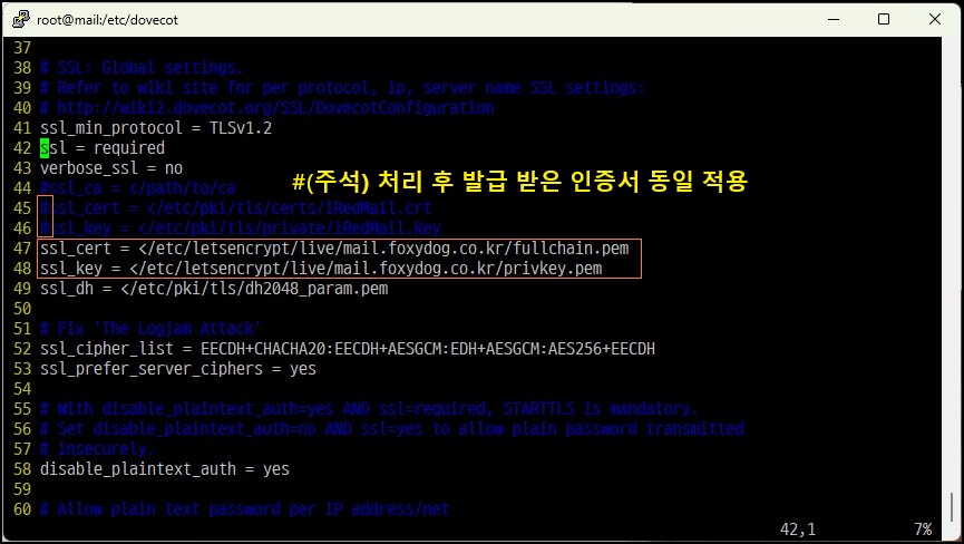#(주석 처리) ssl_cert = </etc/pki/tls/certs/iRedMail.crt
