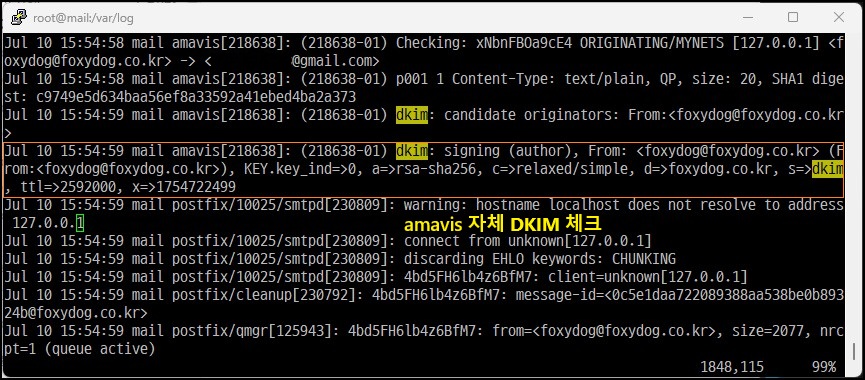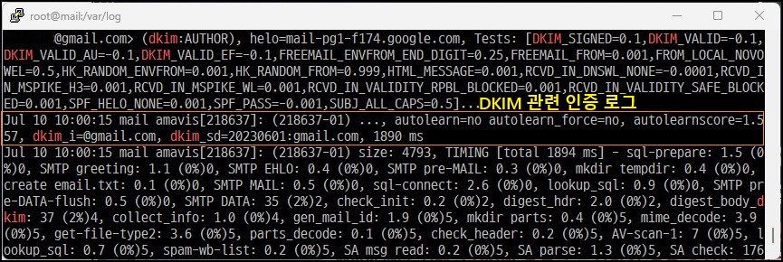 ※ 만약 통과하지 못하면 dkim=fail (verification failed) 메시지를 확인할 수 있으며, SpamAssassin과 연동되어 있어 실패에 대한 스팸 점수가 올라가게 됩니다.