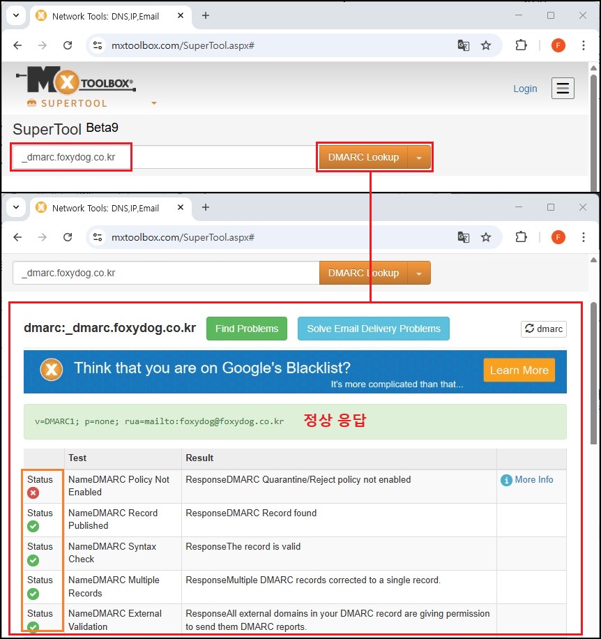 내용 중 Status「X」라고 해서 문제가 있는 게 아니라, 정책을 비활성화했다는 의미로 받아들이시면 됩니다. 즉 DMARC 분석은 하되, 이 메일을 차단하거나 격리하지 말고, 수신자 메일 서버 정책에 맡기겠다는 뜻입니다. 해당 정책도 여러 가지 옵션이 있지만, 아직까지 제대로 활용하지 않고 있습니다. 내 도메인 DNS에 DMARC 세팅을 해도 수신 측이 해당 정책을 체크하는 옵션을 활성화하지 않았다면 큰 의미는 없습니다. 처음에는 none 세팅으로 모니터링하다가 순차적으로 quarantine → reject 적용하는 게 안전합니다.