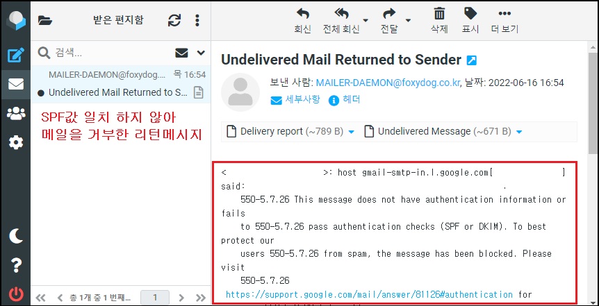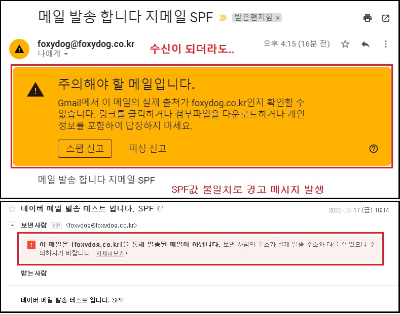 ※ 만약, SPF값이 제대로 등록되어 있지 않을 경우 리턴 메시지를 받거나(높은 확률로), 수신되어도 경고 메시지 발생