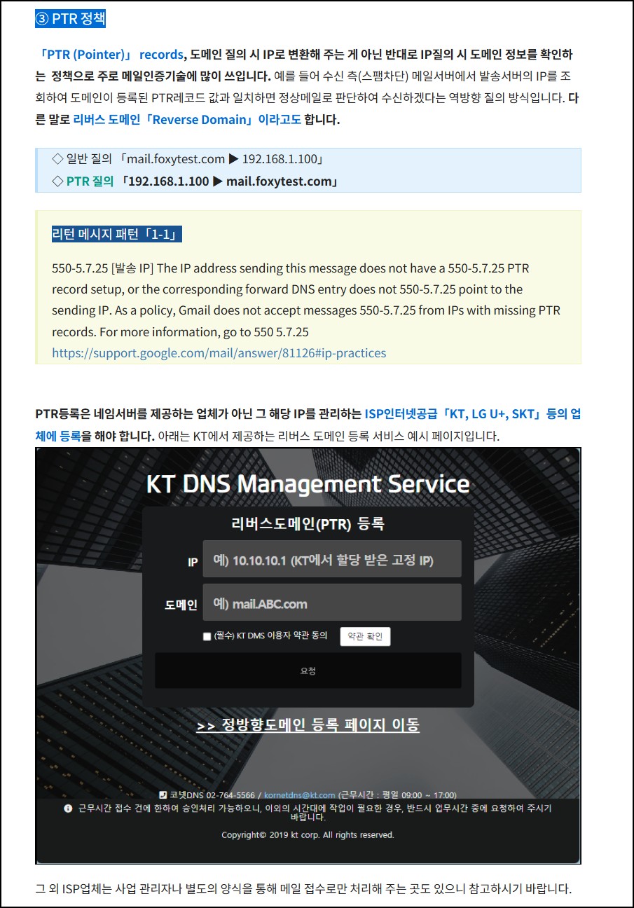 최근 스팸 메일은 점점 더 정교해지고 수법도 다양해지면서, 일반적인 필터링만으로는 완벽하게 차단하기 어려워졌습니다. 이러한 환경에서 메일의 신뢰성을 높이기 위해서는 DNS에 PTR, SPF, DKIM, DMARC와 같은 인증 기술을 적용하여 도메인의 무결성을 강화하는 것이 중요합니다. 이렇게 다양한 메일 보안 기술을 적용하더라도 100% 차단은 어렵지만, 메일 서버와 도메인에 네임서버(DNS)와 같은 인증 설정을 적용해 두면 수신자 입장에서의 신뢰도와 메일 발송(전달) 성공률을 높일 수 있습니다.
