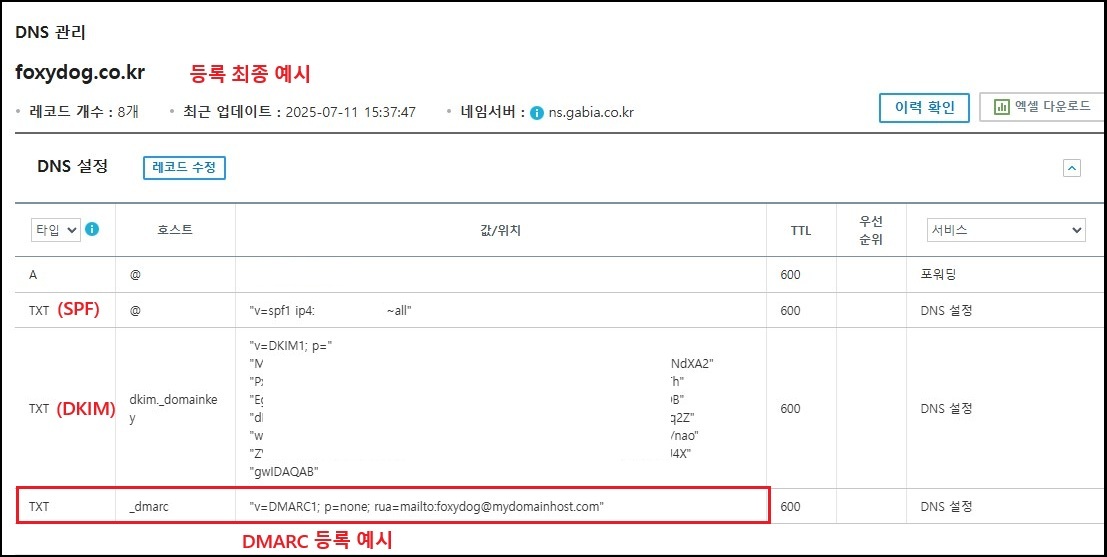 | TXT | _dmarc | "v=DMARC1; p=none; rua=mailto:foxydog@mydomainhost.com" | 3600(기본값) |
