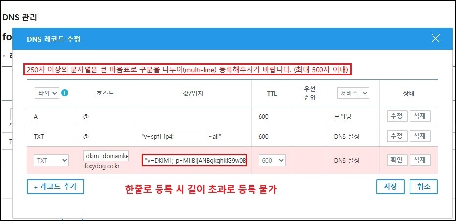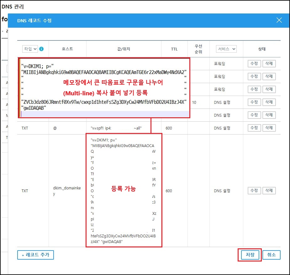 해당 값을 복사하여 그대로 붙여 넣기 하면 되지만, 한 줄로 입력할 경우 문자열이 너무 길어 DNS 관리 사이트의 입력 제한(보통 250자 이하)에 걸려 등록되지 않을 수 있습니다. 이럴 경우 큰 따옴표「" "」로 구분하여 여러 줄로 나누는 multi-line(멀티라인) 형식으로 등록해야 합니다. (보통 최대 500자 이내, 단 관리 사이트마다 다를 수 있음)