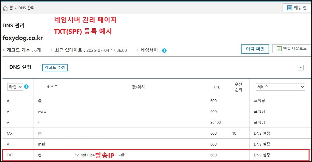 ※ 메일 발송 시 실제 발송 주체는 메일 서버가 아닌 DNS의 TXT(SPF) 레코드에 의해 검증되므로, DNS 관리 페이지에서 반드시 SPF 값을 등록해야 합니다. 혼동하기 쉬운 부분으로 SPF값은 일종의 메일 인증 기술 이름으로 실제 등록은 TXT레코드에 등록을 합니다. SPF 등록 관련 추가 정보(리턴 메일 포함)