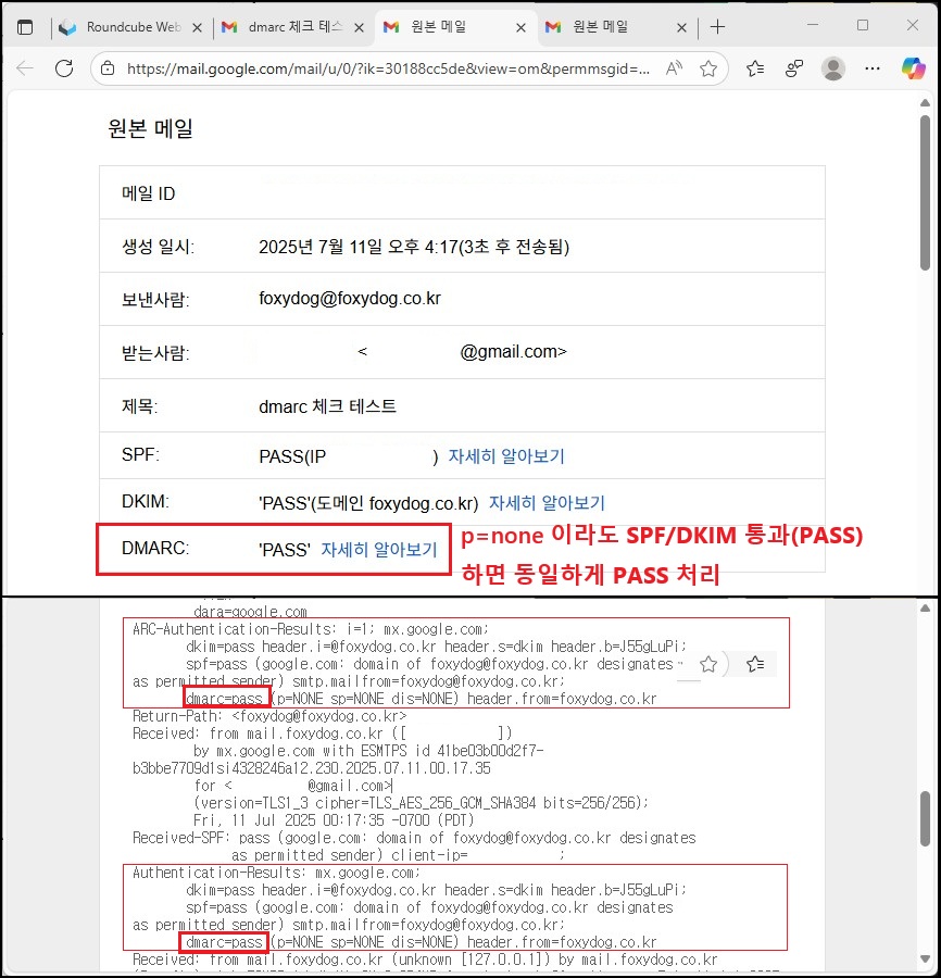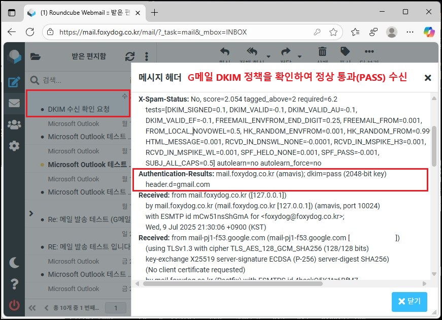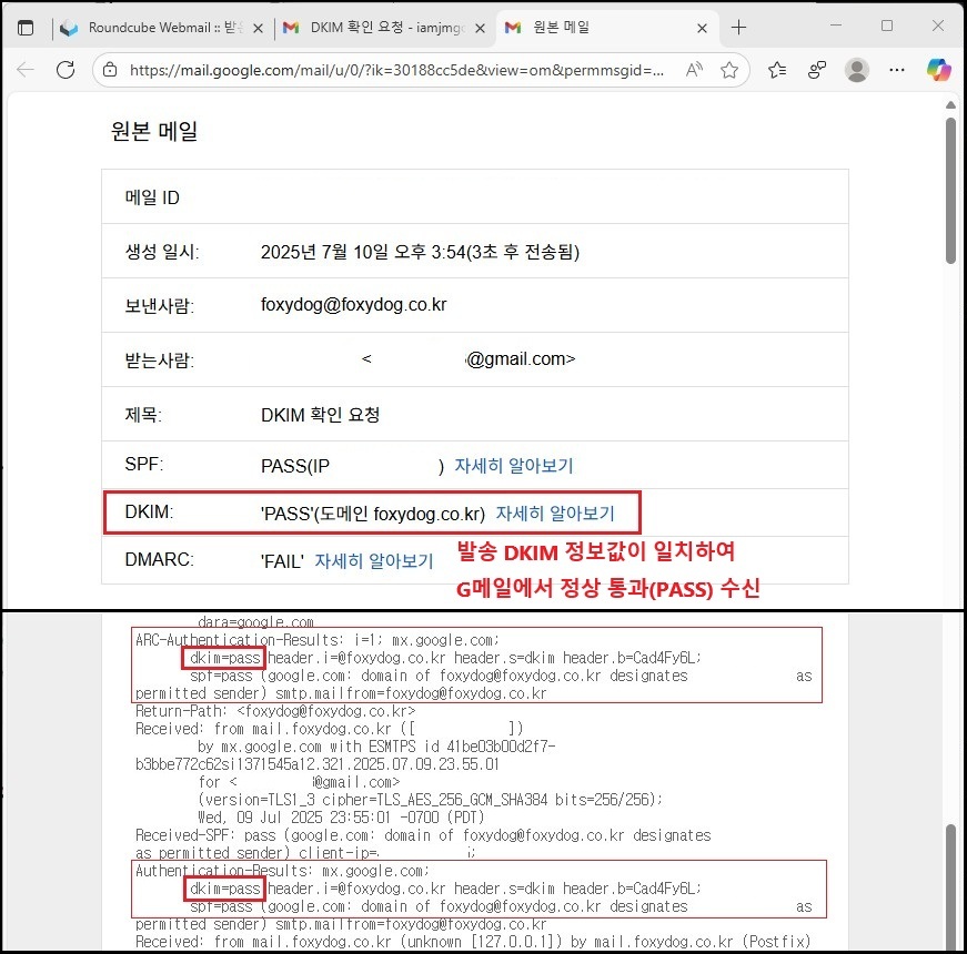 G메일의 수신 원본 헤더에서 Authentication-Results(인증 결과) 항목을 확인하면, SPF뿐만 아니라 DKIM도 PASS로 표시된 것을 볼 수 있습니다. 이는 메일 서버에서 서명한 DKIM 키와 DNS에 등록된 공개 키가 정상적으로 일치했다는 뜻입니다. 만약 일치하지 않거나 설정에 문제가 있다면 FAIL로 표시됩니다.