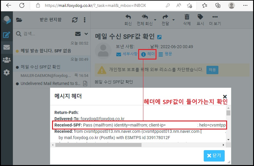 ※ iRedMail 오픈소스 메일 서버에서는 자체 Postfix 확장 모듈인 iRedAPD를 사용하므로, 기본적으로 수신 메일에 대한 SPF 검사 정책은 적용되어 있지 않습니다. 관련 내용은 이전에 작성한 포스팅인 메일서버등록제(SPF:Sender Policy Framework)를 참고해 주세요. SPF 검사 기능을 직접 적용하면, 수신 시 발신자의 SPF 레코드를 확인하고 통과될 경우 메일 헤더에 해당 결과를 표시할 수 있게 됩니다. (캡처 참고)