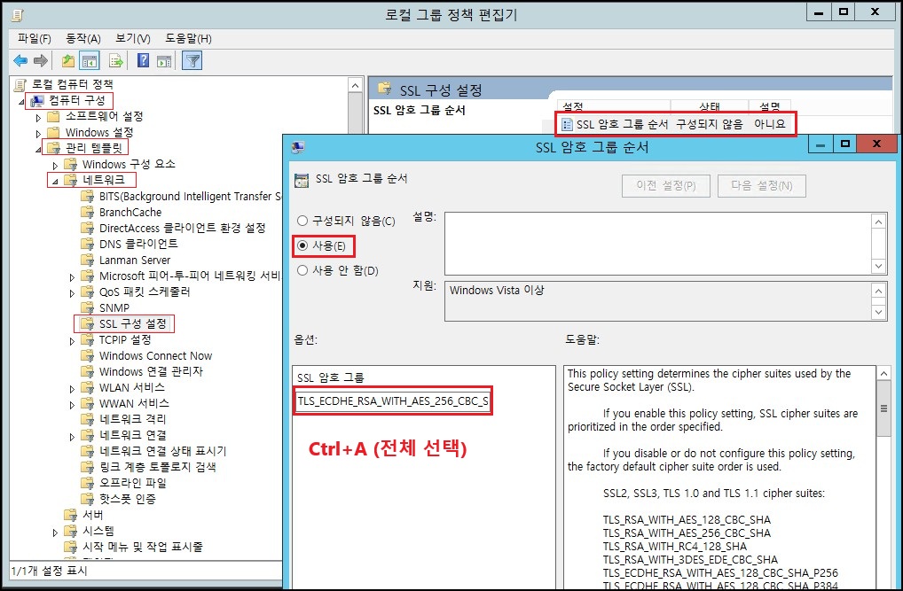 위치: 컴퓨터 구성→관리 템플릿→네트워크→SSL 구성 설정→[SSL 암호 그룹 순서] (더블 클릭)