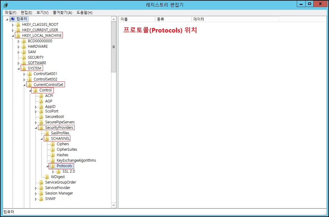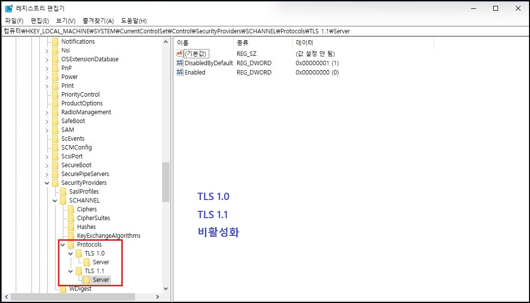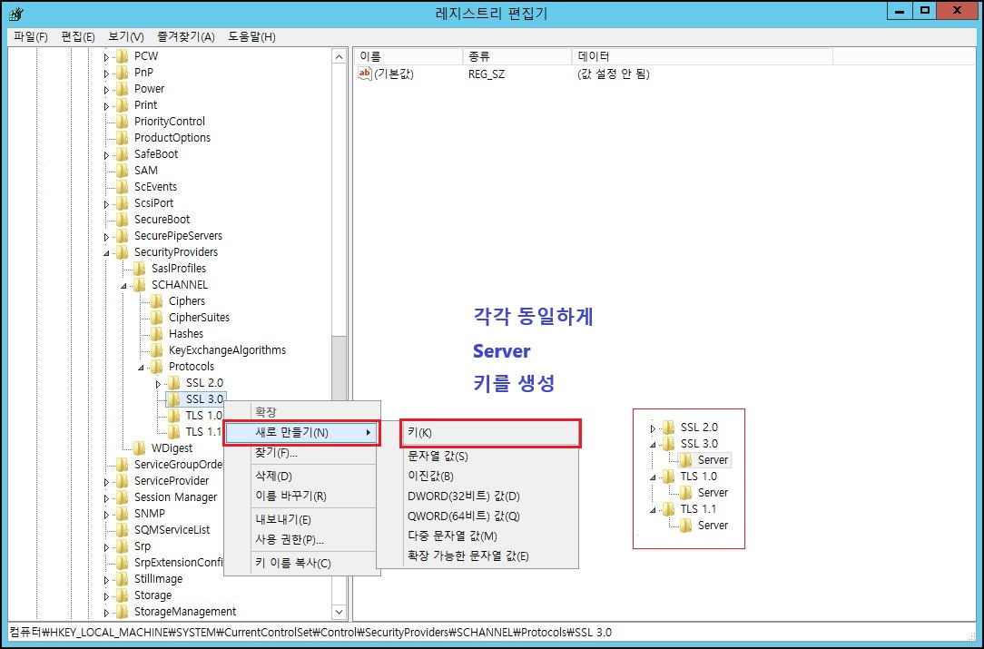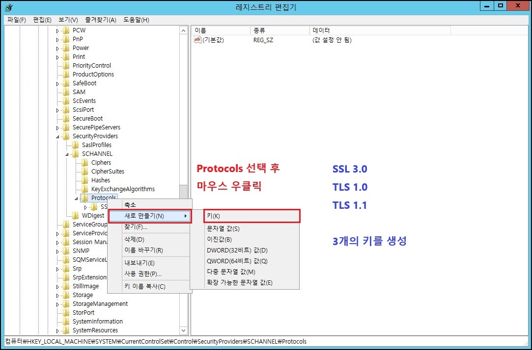- "Protocols" 우클릭 → 새로 만들기 → 키(K) [예 → SSL3.0 / TLS 1.0 / TLS 1.1]
