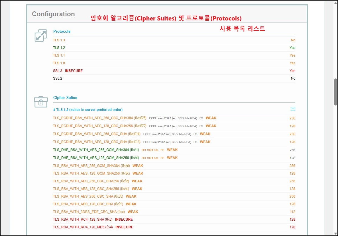 ※ 리눅스/유닉스 서버가 있다면 nmap 네트워크 점검 툴을 이용합니다. 옵션 중 「--script ssl-enum-ciphers」옵션을 쓰면 지원되는 프로토콜(SSL/TLS), Cipher Suite 목록, 키 교환 알고리즘, 취약점 경고까지 확인할 수 있습니다.