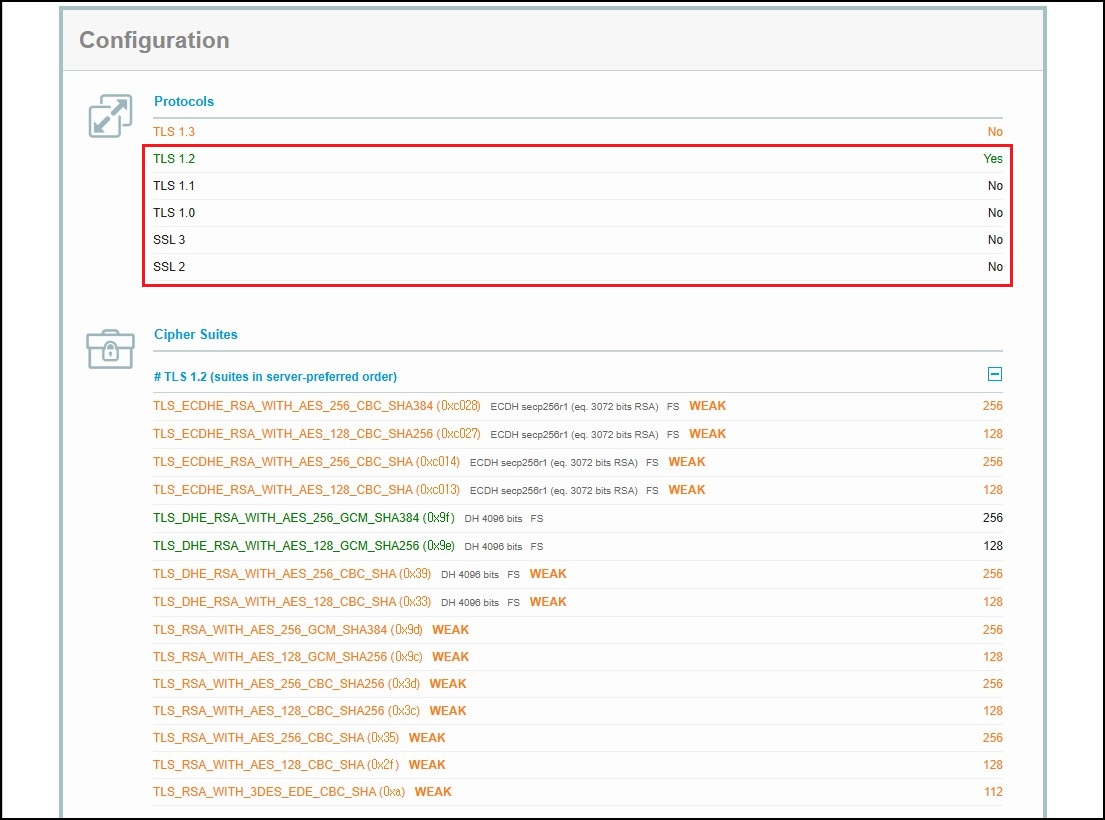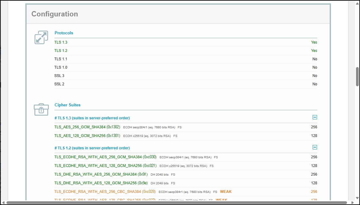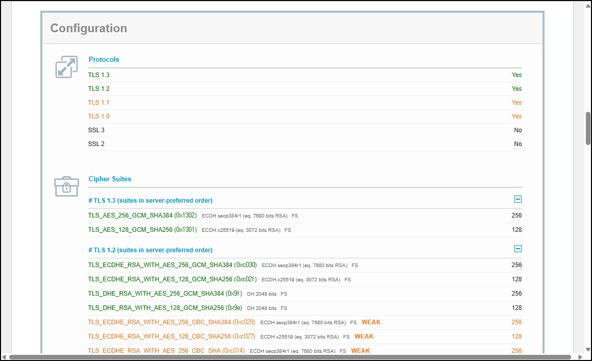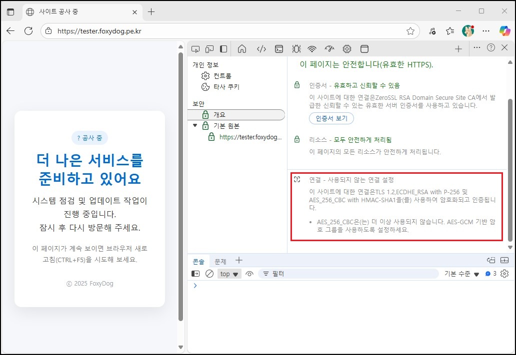 브라우저에서도 AES_256_CBC (단순 TLS_RSA 기반 암호화)에 대해 더 이상 권장하지 않는다는 경고가 표시되는 경우가 있습니다. 이는 암호화 자체가 이루어지고 보안 인증서에 문제는 없더라도 해당 방식이 취약점에 노출될 가능성이 있음을 뜻합니다. 따라서 「 PFS(ECDHE) + GCM(모던)」기반 암호 그룹을 우선적으로 사용하도록 권장하는 안내가 나오고 있습니다. 최신 운영체제에서는 기본적으로 TLS 1.3과 같은 최신 프로토콜 및 현대적 암호화 알고리즘이 활성화되어 있어 보다 안전한 통신이 이루어집니다.