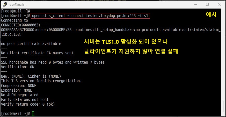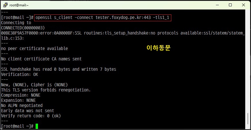 # openssl s_client -connect mydomain:443 -tls1_1 [TLS 1.1 연결 테스트]