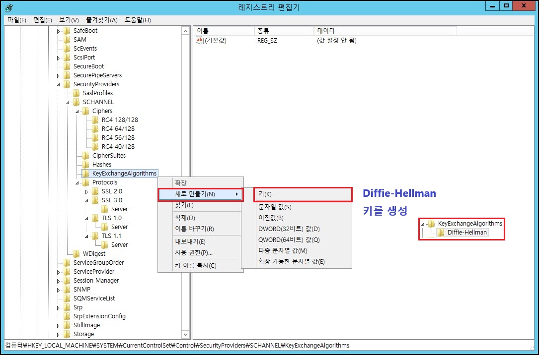 - KeyExchangeAlgorithms 밑에 Diffie-Hellman 키가 없으면 새로 만듭니다.