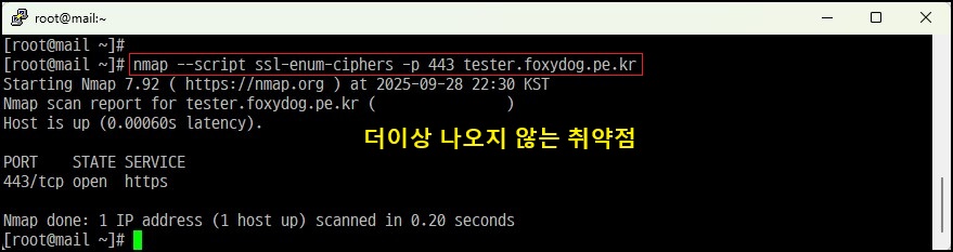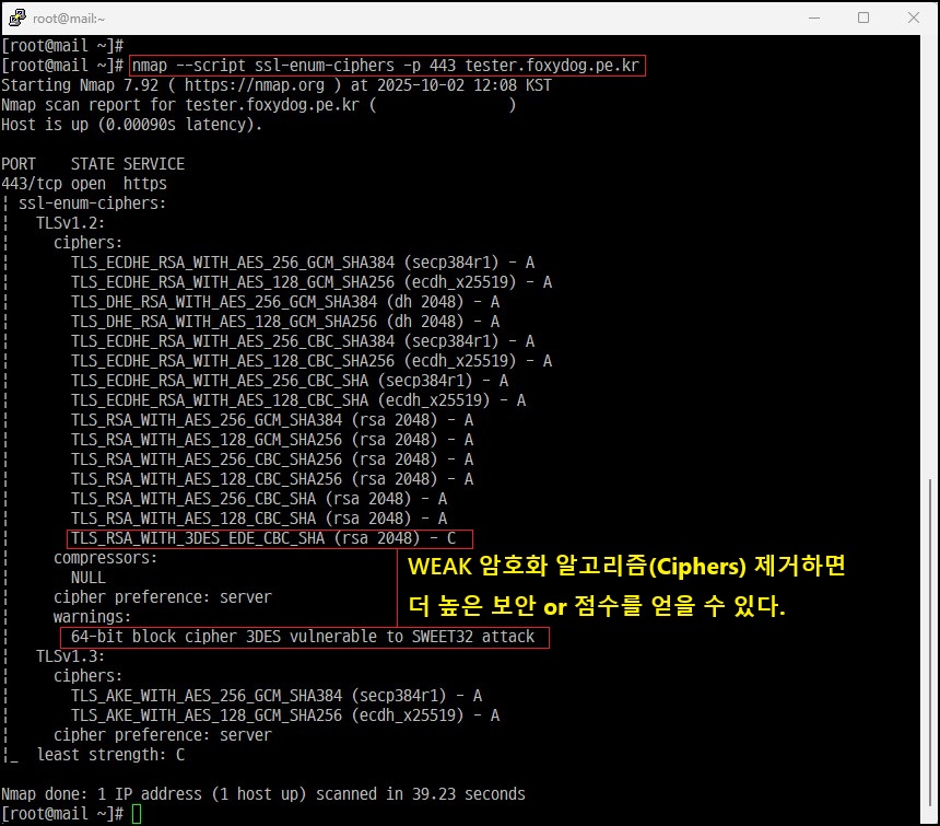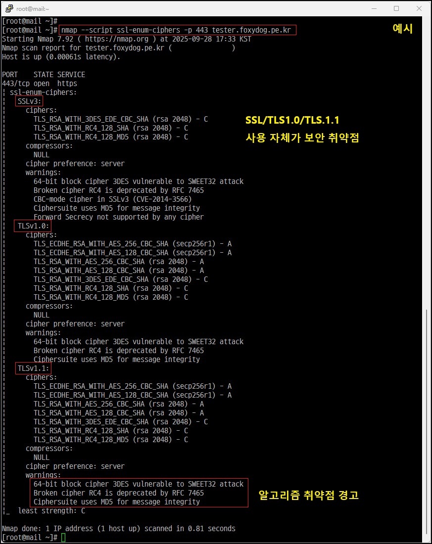 # nmap --script ssl-enum-ciphers -p 443 mydomain [명령어 입력, 아래는 예시]