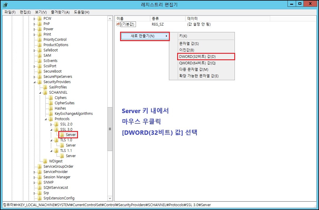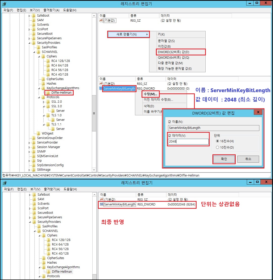 - 안에 DWORD (32비트) 값 만들기 [예 → 이름: ServerMinKeyBitLength, 값: 2048 (단위는 상관없음)]