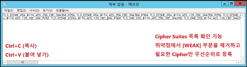※ 사용으로 변경 후 암호 그룹을 전체 선택 후 메모장 같은 곳에 복사 붙여 넣기 하면 사용 중인 Cipher 목록을 확인할 수 있으며 취약점에서 [WEAK] 부분을 제거하고 필요한 Cipher만 우선순위로 등록하면 됩니다. 단, 사용자에 따라 클라이언트 연결이나 원격접속이 되지 않는 등 다양한 문제가 발생할 수 있으니 테스트가 필요합니다.