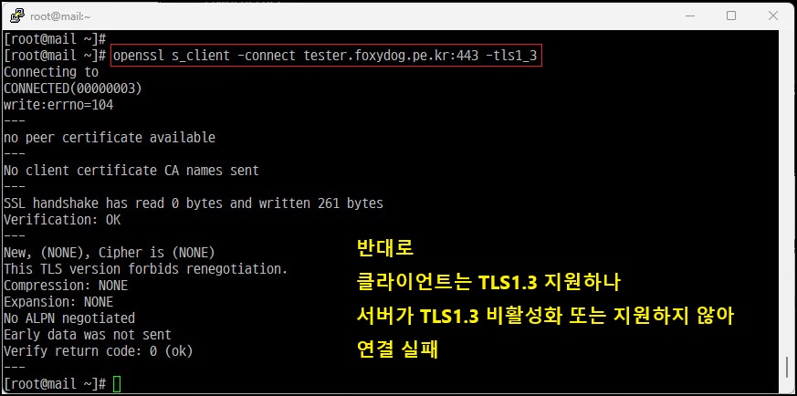 # openssl s_client -connect mydomain:443 -tls1_3 [TLS 1.3 연결 테스트]