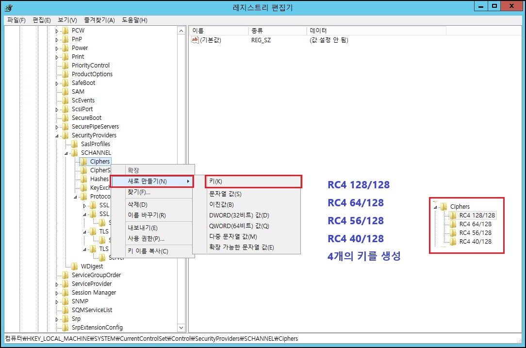 - "Ciphers" 우클릭 → 새로 만들기 → 키(K) 이름을 각각 아래처럼 만듭니다