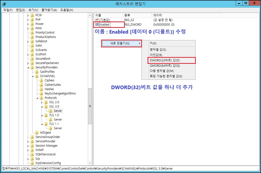- Server 키 안에서 → 우클릭 → 새로 만들기 → DWORD(32비트) 값(D) [예 → 이름: Enabled, 값: 0 (디폴트)]