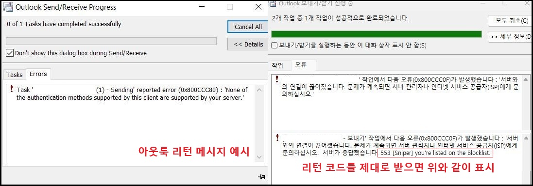 일반적으로 리턴 메시지에는 관련 URL이 함께 제공되며, 관리자(또는 사용자)가 직접 접속해 차단 해제 요청을 할 수 있습니다. 특히 마이크로소프트 아웃룩 같은 클라이언트 프로그램을 사용할 때 수신은 정상인데 발송(SMTP) 단계에서 차단된다면, 해당 구간에서 스팸 필터가 RBL 조회를 수행하고 있을 확률이 높다는 뜻이기도 합니다. 이 내용은 이전 포스트에서도 한번 다룬 적이 있으므로, 여기에서는 간단히? 정리하는 수준으로 넘어가겠습니다.