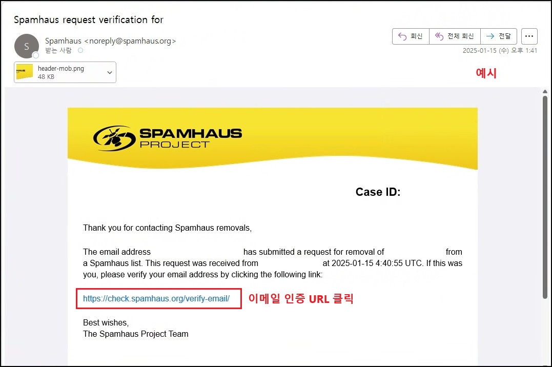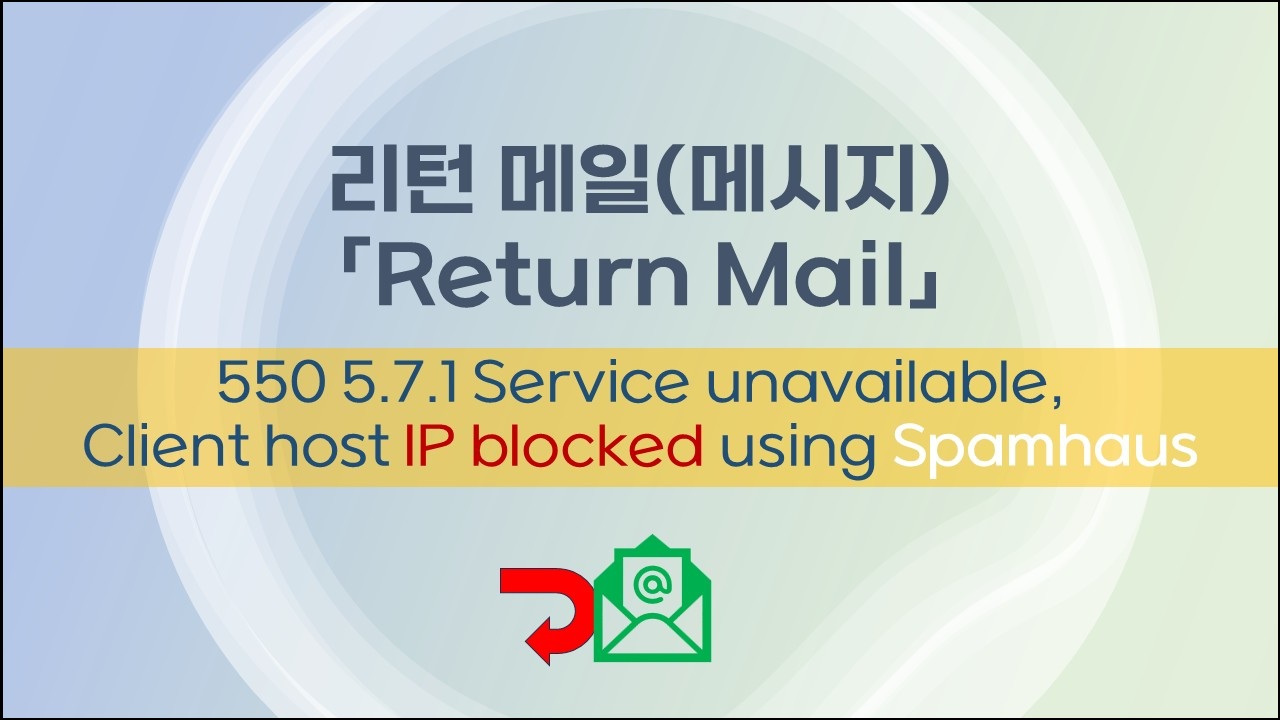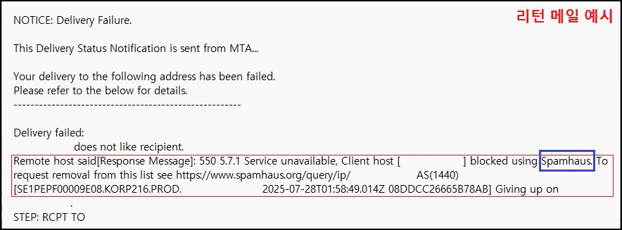 Remote host said[Response Message]: 550 5.7.1 Service unavailable, Client host [IP] blocked using Spamhaus. To request removal from this list see https://www.spamhaus.org/query/ip/클라이언트 IP AS(1440)