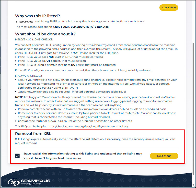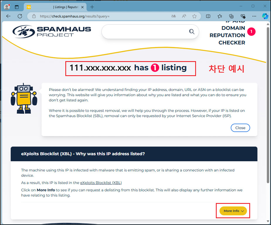 위와 같이 IP에 문제가 없다면 「IP has no issues」 메시지가 나오며, 차단되어 있으면 「IP has listing」 형태로 나옵니다. 그리고 차단된 사유가 나열되며 「More info」 자세히 보기를 클릭하면 좀 더 상세한 내용이 나옵니다.