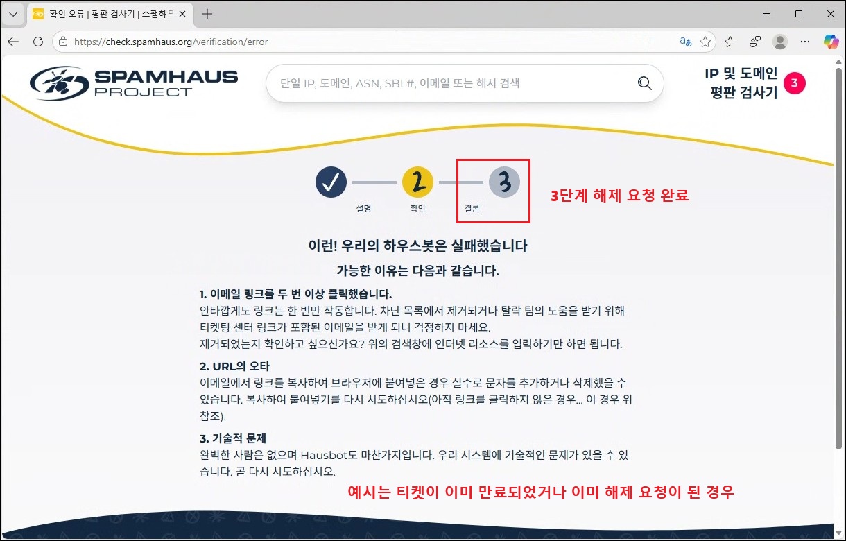 다음과 같이 인증 메일이 한 통 수신되며, 본문에 포함된 URL을 클릭하면 최종적으로 해제 요청이 완료됩니다. 아래 예시는 인증 시간이 만료되었거나, 이미 해제 요청이 처리된 상태에서 다시 시도했을 때 나타나는 화면입니다. 이후 재 조회 시 「IP has no issues」 메시지가 나오면 정상적으로 해제가 완료된 것입니다. 다만, 메인 서버만 반영되는 것이 아니라 RBL 정보를 조회하는 여러 서버들이 순차적으로 업데이트되기 때문에 실제 반영까지 시간이 걸릴 수 있습니다. 보통 여유 있게 1시간 간격으로 재확인하는 것이 좋습니다.