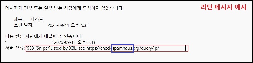 서버 오류: '553 [Sniper]Listed by XBL, see https://check.spamhaus.org/query/ip/클라이언트IP'