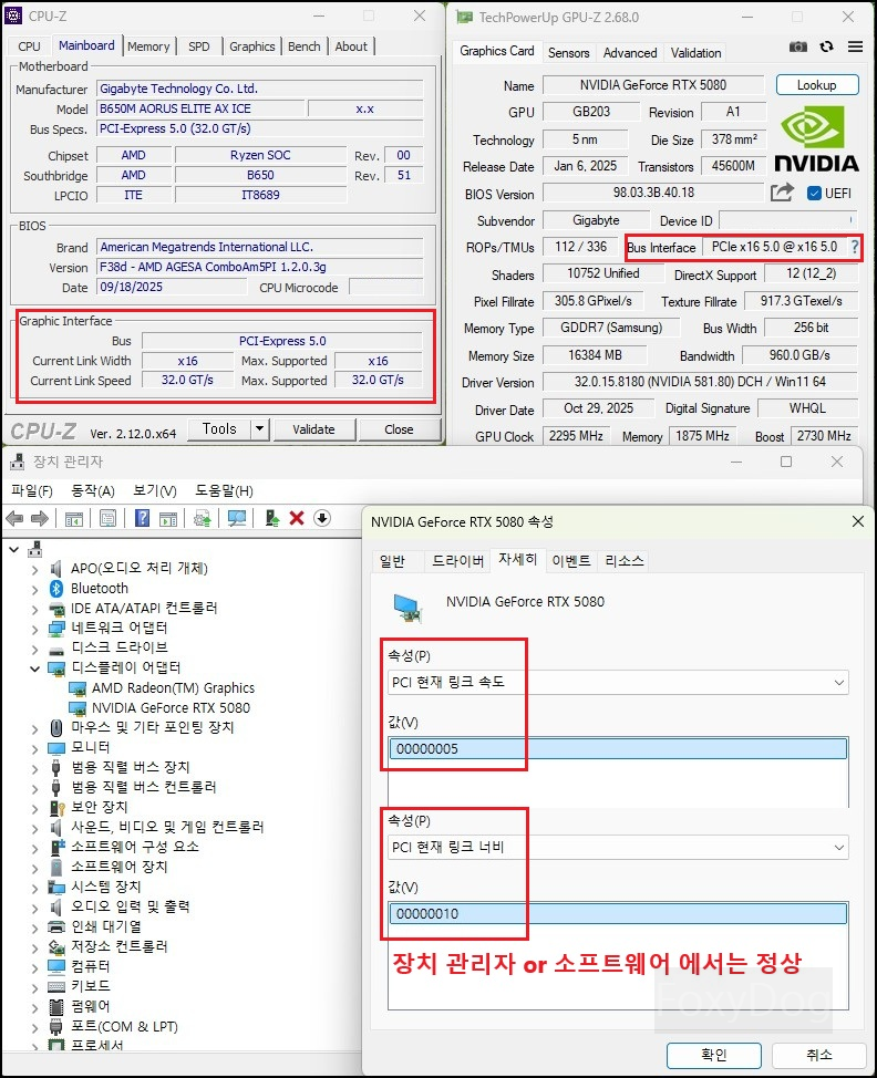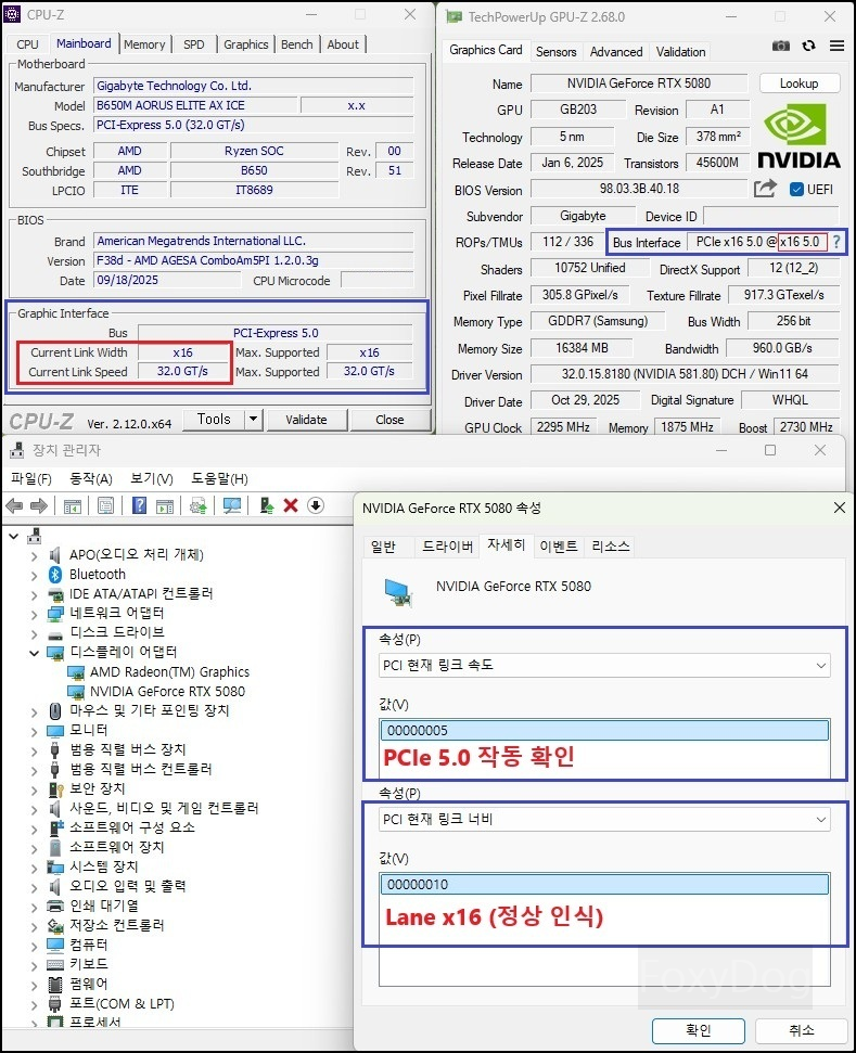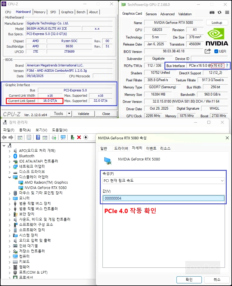 제가 사용하는 구성은 메인보드는 GIGABYTE B650M AORUS ELITE AX ICE(PCIe 4.0), 라이저 케이블은 HYTE Luxury Riser Cable(PCIe 4.0)이며, 그래픽카드만 GIGABYTE RTX 5080 AERO OC SFF(PCIe 5.0) 지원입니다. 즉, 시스템 구성상 PCIe 5.0이 나올 수 없는 환경임에도 5.0으로 표기되고 있어, 실제로 어떻게 동작하고 있는지 직접 확인과 테스트를 진행해 보기로 했습니다.