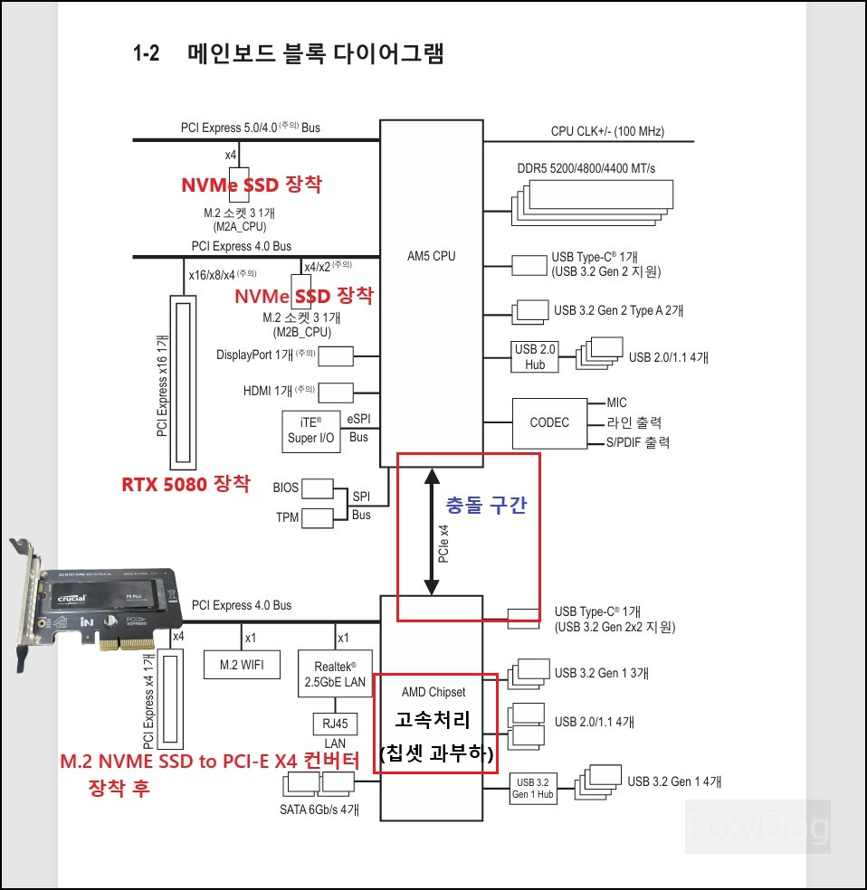 매뉴얼을 처음 봤는데 메인보드들이 대체로 전부 이런 구조로 되어 있습니다. 저는 착각을 하고 있었던 게 전부 AM5 CPU 쪽으로 같은 레인을 공유하여 충돌하는 게 아닌가 싶었는데, 하단 PCIe x4 부분은 AMD Chipset, PCIe x4 하나의 통로(단일 링크)를 통해 데이터를 주고받고 있는 환경이었습니다. M.2 소켓(NVMe)과 PCIe x16(RTX 5080) 레인은 AM5 CPU를 직결로 바라보고 있으며 동시에 처리할 수 있는 구조입니다.