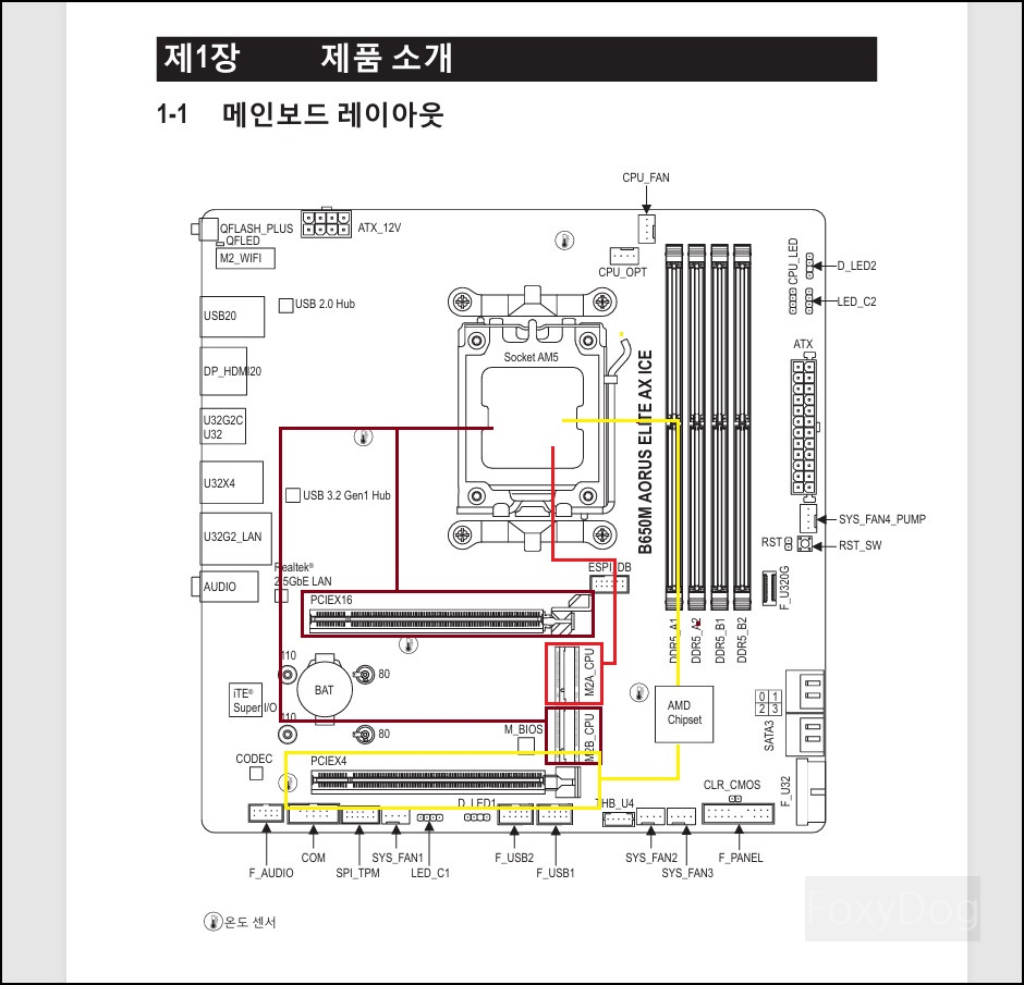 자료를 찾아보니, 이와 같은 증상이 의외로 흔하게 발생하는 문제였고, ChatGPT를 샅샅이 심문(?)한 끝에 그 원인을 어느 정도 파악할 수 있었습니다. 솔직히 글로만 설명된 자료들은 이해가 잘 되지 않았는데, 관련 구조도를 확인해 보니 왜 멈춤(프리징) 현상이 생기는지 대충이라도 알게 될 겁니다. 해당 내용은 기가바이트 공식 홈페이지 매뉴얼을 참고했습니다. 아래 메인보드 레이아웃과 블록 다이어그램(구조도)을 같이 보면 더욱 좋습니다.